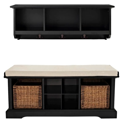 Organize your entryway with a sophisticated bench set that’s built to last. This cubby bench has several slots for storing shoes and other small items, and also makes for a comfortable seat. Included baskets allow for storage of scarves, gloves, and hats while adding a beautiful touch to your entryway. The matching wall unit features open shelves for storing hats and the like. Four hooks are perfect for hanging a family of coats and jackets.