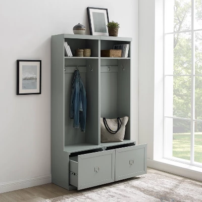 Tame your tumultuous entryway with the Harper 2pc Entryway Set. Comprised of two slim hall trees side by side, this set is a home organizer’s dream. A total of eight classic double hooks will provide hanging storage for coats, hats, and book bags. Two full-extension storage drawers with label holder hardware can be customized with personal labels. The two upper shelves are ideal for small storage baskets to hold your wallet and keys. The Harper 2pc Entryway Set pairs modularly with other items in the collection, creating the look of genuine built-in storage.