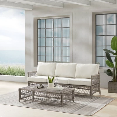 Create the look of an island retreat with the Thatcher 2pc Sofa Set. This set features sturdy steel frames wrapped in beautiful all-weather resin wicker and thick weather-resistant cushions. The coffee table ottoman is designed with versatility in mind. Add extra seating or prop up your feet with the included cushion, or remove the cushion to reveal a wicker tabletop perfect for resting a cool drink on a warm day. Both stylish and functional, the Thatcher Sofa Set will have you lounging outdoors in sophisticated comfort.