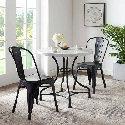 Quaint and classy, the Madeleine 3pc Dining Set with Amelia Chairs brings stylish café dining to your home. The round faux marble tabletop creates an upscale look while the steel base and Amelia chairs add a French industrial aesthetic. The open pedestal design of the table base forms a sleek profile and provides cozy seating for two.