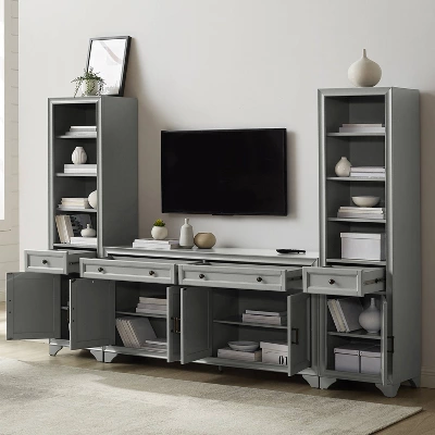 Whether you love a traditional look or a modern farmhouse vibe, the Tara 3pc Entertainment Set is a stylish take on a classic entertainment center. The sideboard features two wide full-extension drawers and two large cabinets with adjustable shelves. Each bookcase has a full-extension drawer and three open adjustable shelves. The Tara 3pc Entertainment Set is a great storage option for framing large TVs up to 65″.