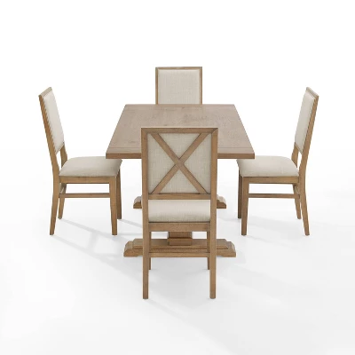 Embrace the laid-back style of modern farmhouse design with the Joanna 5pc Dining Set. The large rectangle trestle table pairs beautifully with the upholstered dining chairs, offering seating for four diners. Each chair features upholstered backs and seats with a classic wooden X design on the back. Balancing the table’s substantial trestle base is a spacious tabletop, making the Joanna 5pc Dining Set a perfect spot to gather for a family meal.
