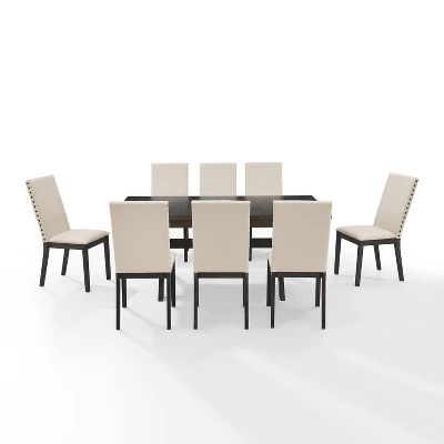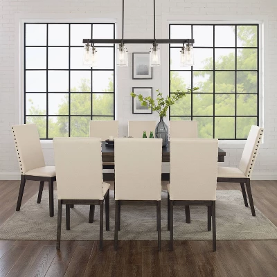 The Hayden 9pc Dining Set brings rustic elegance to family gatherings. Featuring X-shaped legs and a trestle base, the farmhouse table pairs beautifully with the Parsons style dining chairs. The extendable table’s 18” leaf offers space for eight diners, making the Hayden 9pc Dining Set a timeless centerpiece for your dining room.