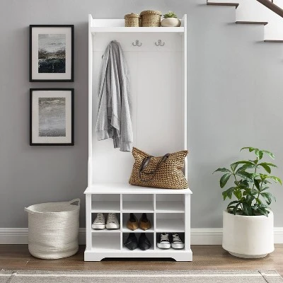Tackle the clutter of your home’s high traffic zone with the Anderson Shoe Storage Hall Tree. Designed to solve the problem of shoes, coats, and book bags clogging up your home’s entrance, this hall tree has nine shoe compartments and three double hooks. With the Anderson Hall Tree, you’ll come home to a tidy entryway where you can slip off your shoes and hang your hat at the end of the day.