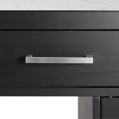 Ready to take center stage, this kitchen island offers storage and food prep in a sleek functional package. A beautiful faux marble countertop and bar hardware create a look of luxury with a modern edge. With a pass-through cabinet and two pass-through drawers, you can easily access cookware, small appliances, and utensils from either side of the island. The four open stationary shelves on the sides of the island keep necessities close at hand while an adjustable shelf within the cabinet provides versatility in storage space.