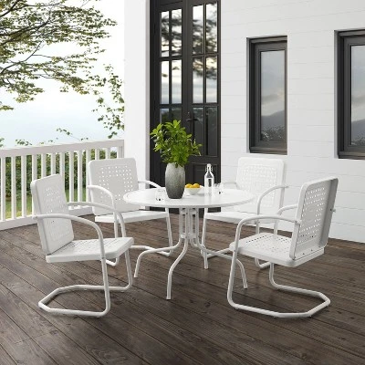 Nostalgia abounds with the Bates 5pc Dining Set. Four vintage styled chairs in vibrant colors surround a simple metal dining table for a fun and functional outdoor dining experience. Each chair features a square back with a unique basket weave design that allows air to circulate, adding to the comfort of the seat. With a cantilever base, the chairs offer just enough flex for relaxed al fresco dining.