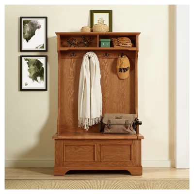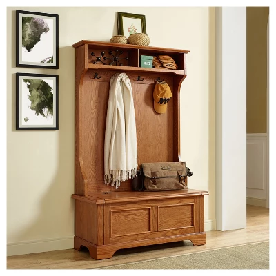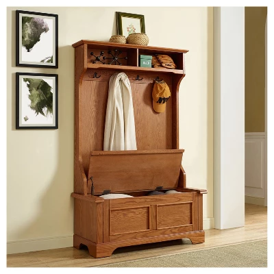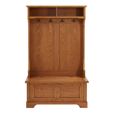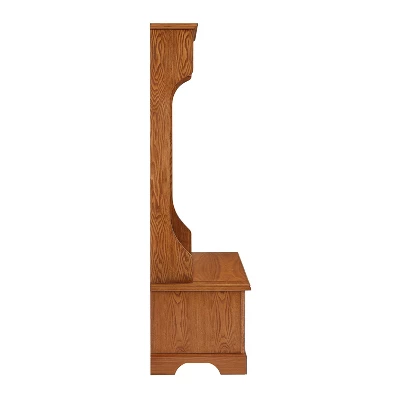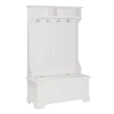 Enliven your entryway or add function to any foyer with the Campbell Hall Tree by Crosley. Raised detailing and genuine metal hardware maintains traditional appeal and matches the rest of the Campbell collection. Four double hooks offer plenty of storage for coats, umbrellas, and keys. The large storage bench offers a place to sit and a spacious area below to stow blankets, jackets, and accessories. Two cubbies at the top provide the perfect place for shoes or other small items. The Campbell Hall Tree is the classic focal point you’ve been looking for.