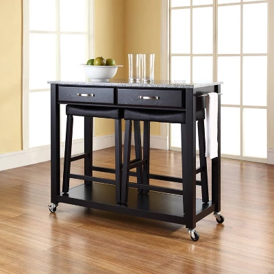 Gray Granite Top Kitchen Prep Cart With 2 Upholstered Saddle Stools – Crosley