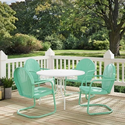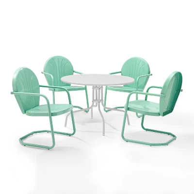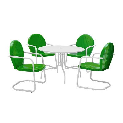 Add retro simplicity and function to outdoor dining with the Griffith 5 Piece Dining Set. Featuring a powder-coated finish over durable steel, the dining table partners with four classic Griffith chairs. Each chair has a vintage style that comes in a variety of vibrant colors. The chairs’ cantilever bases offer just enough flex for lounging in comfort. The simple dining table has a sturdy pedestal base that allows the stunning Griffith chairs to shine.