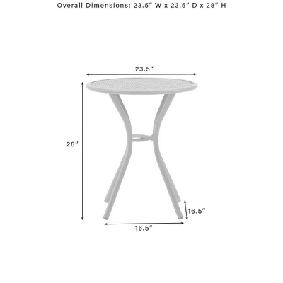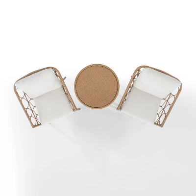 Turn outdoor dining into a breezy bohemian affair with the Juniper 3pc Bistro Set. Crafted from rattan-style resin wicker, this set showcases delicate woven loops over steel frames. With lush, moisture-resistant cushions on the armchairs and a chic round table, the Juniper bistro set will be your favorite spot for a romantic meal al fresco.