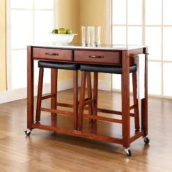 Stainless Steel Top Kitchen Prep Cart With 2 Upholstered Saddle Stools Cherry – Crosley