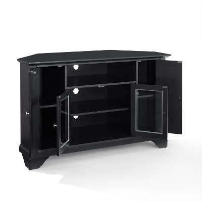 Enhance your living space with Crosley’s impeccably-crafted Corner TV stand. This signature cabinet accommodates most 48″ flat panel TVs, and is handsomely proportioned featuring character-rich details sure to impress. Raised panel doors strategically conceal stacks of CD/DVDs, and various media paraphernalia. Tempered beveled glass doors not only add a touch of class; they protect those valued electronic components, while allowing for complete use of remote controls. The open storage area generously houses media players and the like. Adjustable shelving offers an abundance of versatility to effortlessly organize by design, while cord management tames the unsightly mess of tangled wires. Style, function, and quality make this cabinet a wise choice for your home furnishings needs.