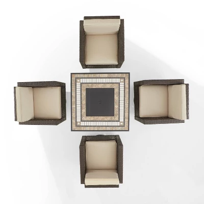 Enjoy an evening around the fire with the Palm Harbor 5pc Conversation Set. Each swivel rocker features a durable steel frame covered in all-weather resin wicker, plus a swivel rocking base for easy movement. The fire table has a tiled stone top on a steel lattice base. Both the propane tank and gas controls are housed within the table, keeping them out of sight but close at hand. Cozy up with family and friends with the Palm Harbor conversation set.
