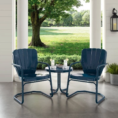 Inspired by the designs of yesteryear, the Ridgeland 3pc Chair Set brings class and charm to your outdoor space. Two vintage-style chairs in vibrant colors surround a simple metal side table for a fun and functional outdoor lounging experience. Each chair features a clamshell back with decorative grooves, plus a cantilever base that provides just enough flex for lounging in comfort. The side table’s sturdy pedestal base is comprised of four metal legs and easily tucks between the chairs, making the Ridgeland 3pc Chair Set ideal for a small balcony or patio.